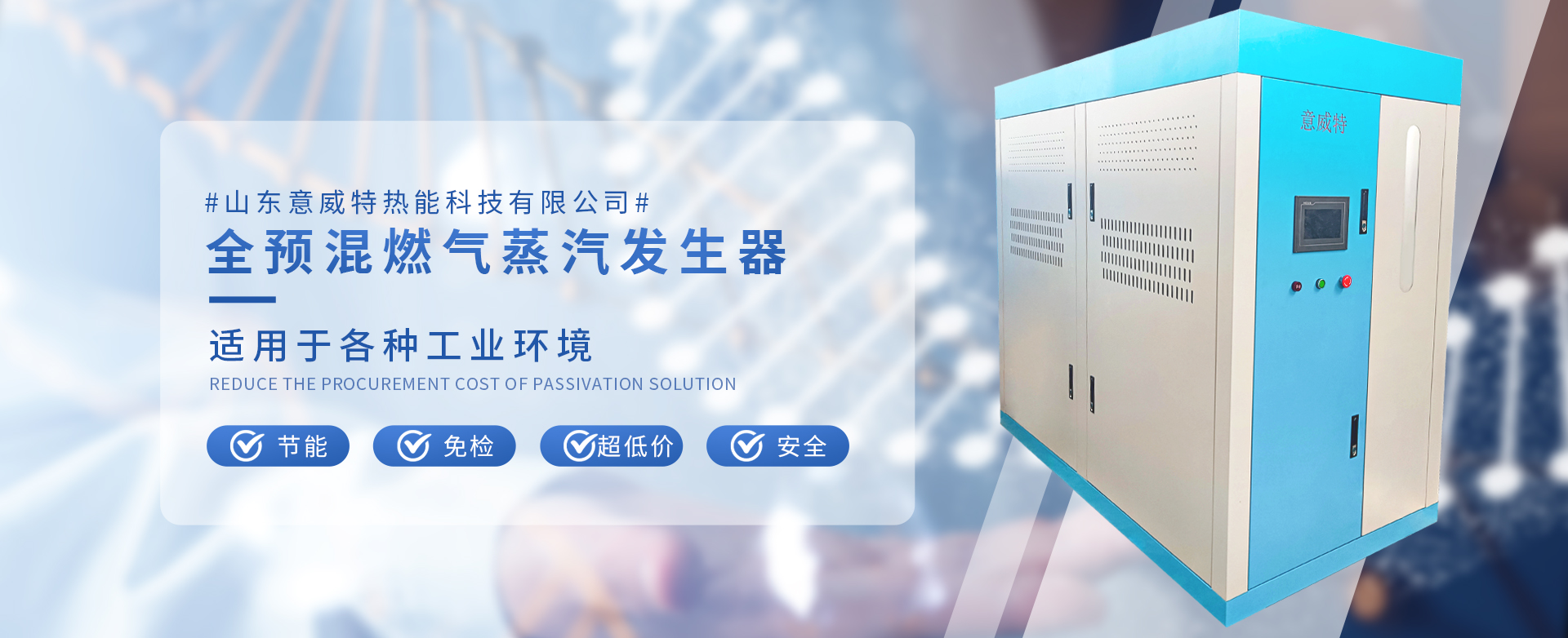山東意威特?zé)崮芸萍加邢薰狙邪l(fā)生產(chǎn)銷售:全預(yù)混蒸汽發(fā)生器,具有節(jié)能、超低氮NOX排放、低噪音、水容量少、啟動(dòng)快、重量輕等特點(diǎn)。適用于各種工業(yè)環(huán)境、節(jié)能、免檢、超低氮、安全。